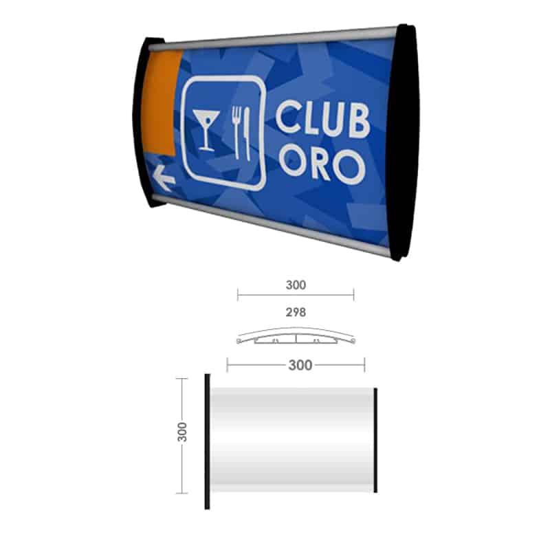 Señalamiento de dos vistas para colocar en pared, sostenido por uno de los extremos laterales, a forma de bandera, con una base plana. Elaborado con perfil de aluminio anodizado natural con tapas de plástico, y cuenta con mica para cubrir gráfico, el cual es impreso en material flexible. Tiene mucha facilidad de cambiar contenido por lo que resulta una opción práctica para edificios.