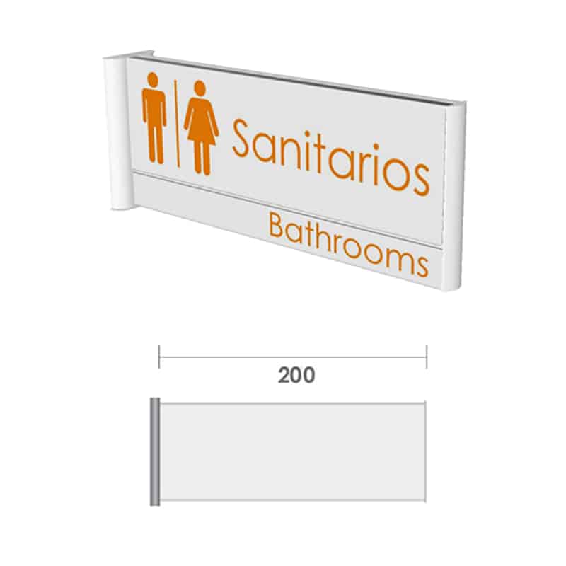 Señalización plana doble cara, horizontal con extrusión de aluminio anodizado. Se completa con tapas de plástico y bracket montable a la pared. Ideal para lograr mayor visibilidad de los señalamientos en pared, sosteniendo el gráfico en uno de sus extremos. Ideal para elevadores, oficinas, rutas de evacuación, entre otras aplicaciones.