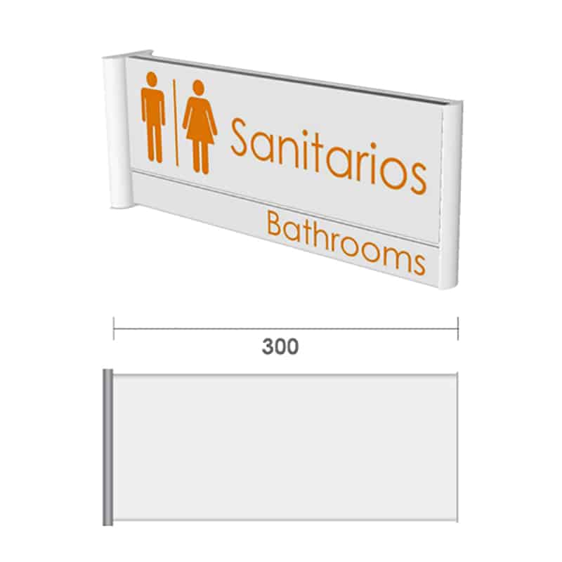 Señalización plana doble cara, horizontal con extrusión de aluminio anodizado. Se completa con tapas de plástico y bracket montable a la pared. Ideal para lograr mayor visibilidad de los señalamientos en pared, sosteniendo el gráfico en uno de sus extremos. Ideal para elevadores, oficinas, rutas de evacuación, entre otras aplicaciones.