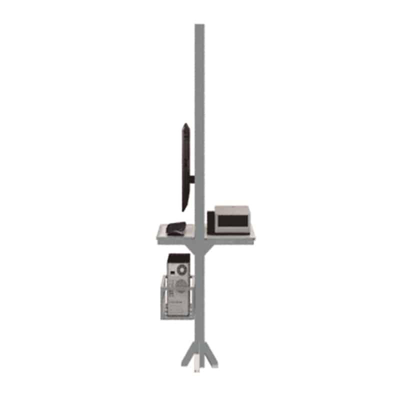 Estructura base para PC, conformada por un poste de perfil alto donde se coloca la pantalla, repisa y espacio cuadrado frontal, y repisa trasera de MDF con melamina, para teclado, CPU e impresora. Es una solución sencilla y eficaz para estación con computadora en escuelas, negocios, locales, entre otros.