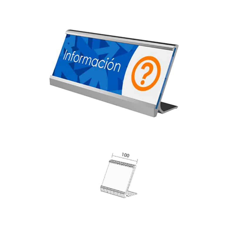 Señalamiento sencillo y práctico para colocación en escritorios o mostradores. Conformado por una base de perfil de aluminio T01 para colocar placa de PVC de 1.5 mm con mensaje impreso con tinta UV. Es una manera sencilla de exhibir un mensaje y que sirva de decoración interior, al alcance de la vista.