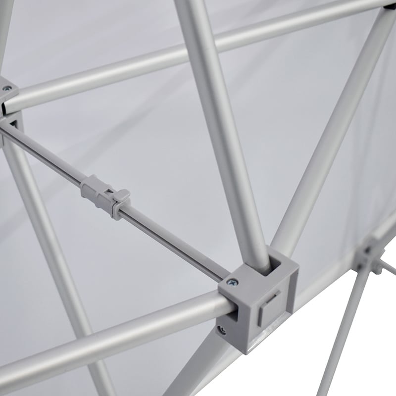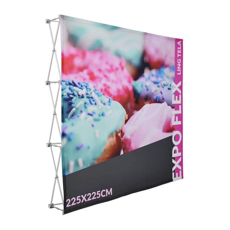 Display plegable el cual está formado por una estructura de aluminio anodizado la cual cuenta con pies niveladores en su base para proveer mayor estabilidad, su perímetro cuenta con velcro por el cual el gráfico en tela sublimada es colocado. Este Expoflex Lingtela es ampliamente utilizado debido a su practicidad y numerosas aplicaciones, desde escenografía, fondo fotográfico, muro publicitario, etc.