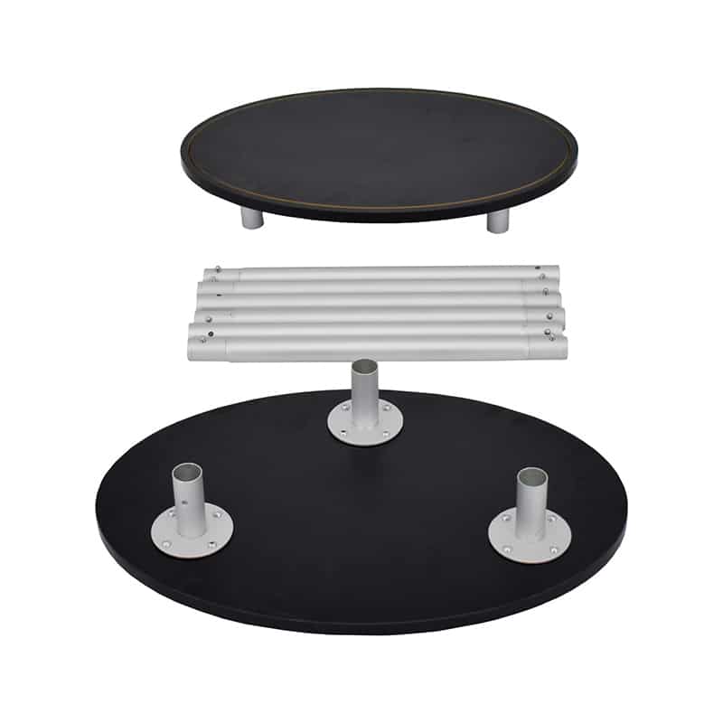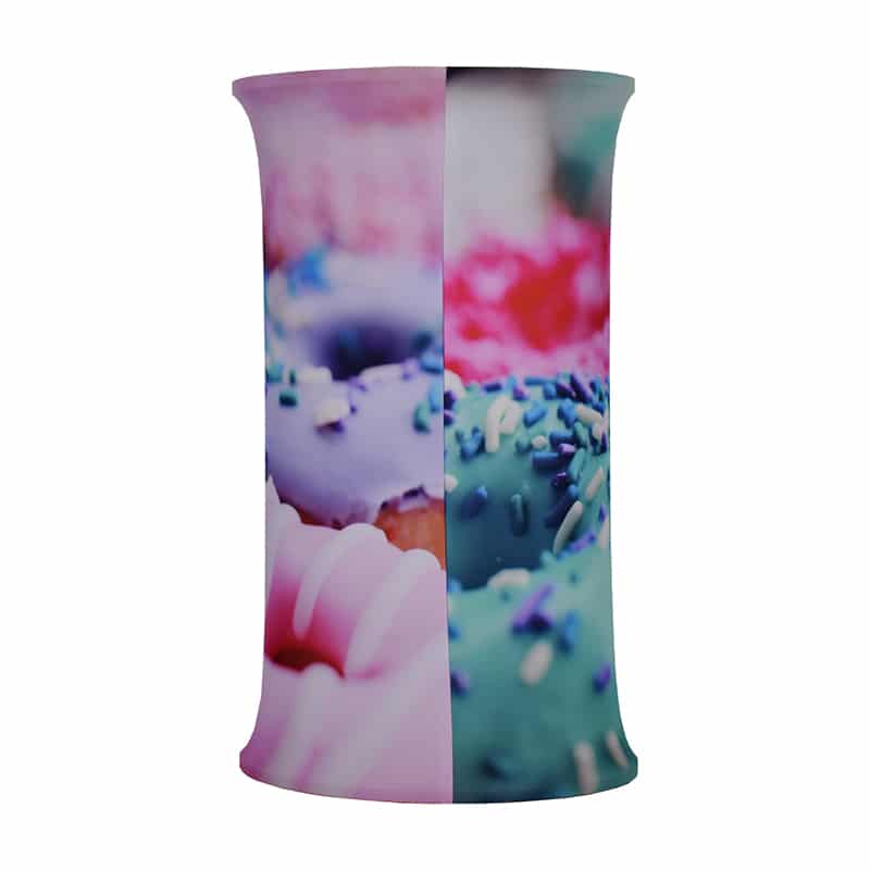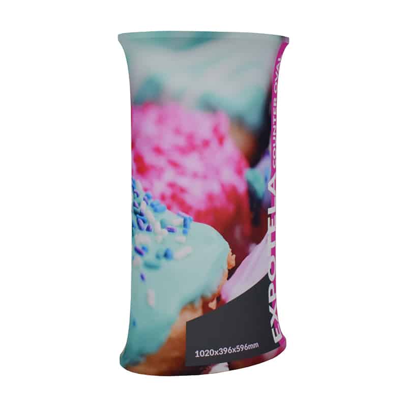 La Mesa de tela ovalada es una estructura formada por tubos de aluminio anodizado y una base y cubierta de MDF laminado, estas cuentan con unas ranuras en las cuales se inserta el gráfico impreso en tela sublimada con perímetro de silicón que es lo que da la forma distintiva a toda la estructura. Es perfecta para eventos sociales, activaciones, exposiciones, entre otros.