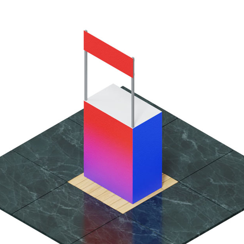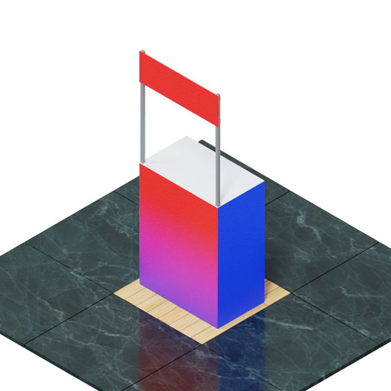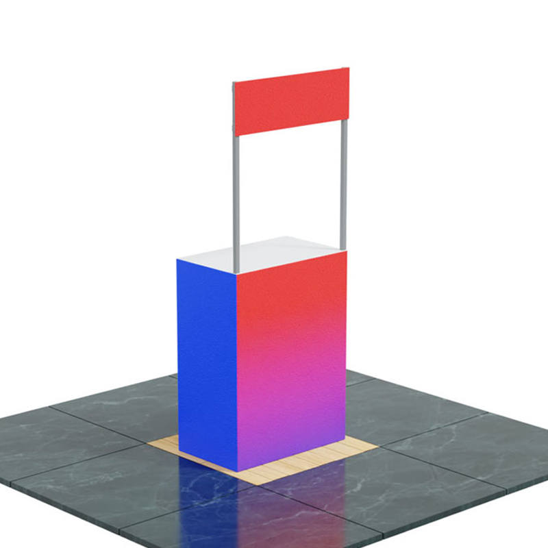 Mesa de exhibición, muy practico de configurar, para eventos de interior. Se conforma por perfiles de aluminio con tapa especial para ensamblar, con ayuda de conectores de plástico en forma de cubo. La estructura tiene forma de mostrador rectangular y un letrero superior. Otorga muchas posibilidades de diseño con las mismas piezas. No requiere herramientas para su armado.