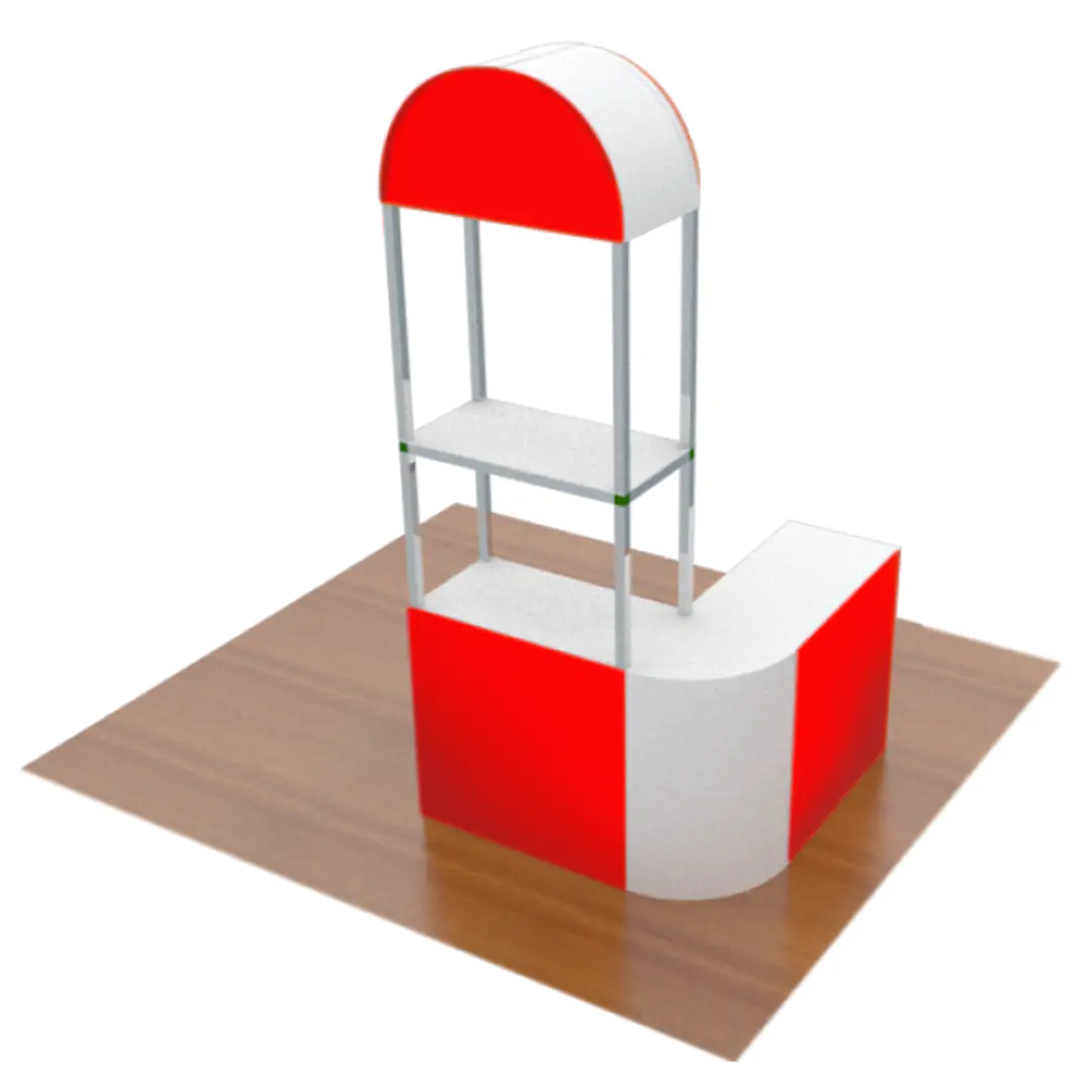Espacio de exhibición personalizado, muy practico de configurar, para eventos de interior. Se conforma por perfiles de aluminio con tapa especial para ensamblar, con ayuda de conectores de plástico en forma de cubo. La estructura configura dos muros perpendiculares, y mostrador rectangular conectado a muro por medio de arco plano. No requiere herramientas para su armado.