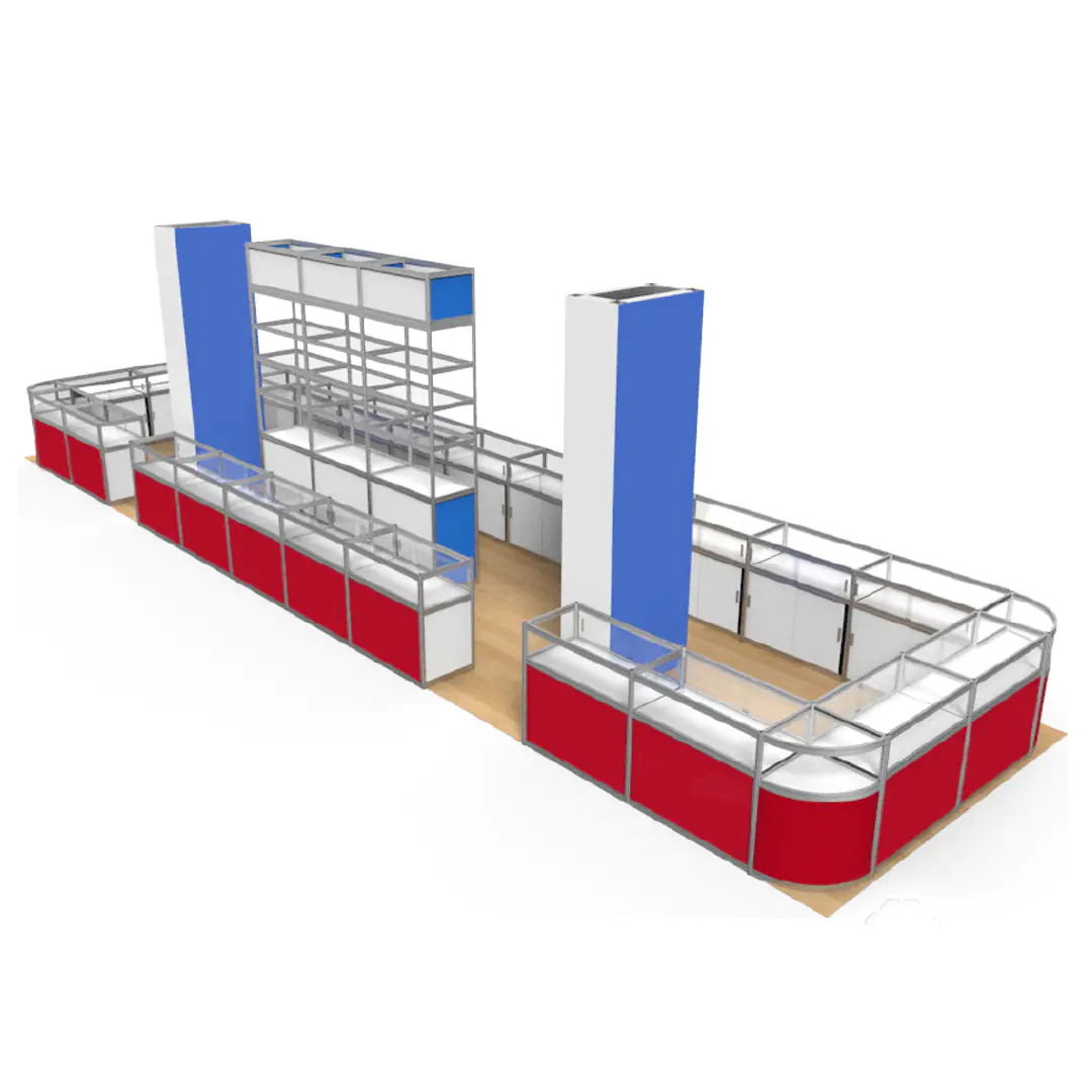 Es un stand de 12x3m atractivo y funcional para exhibiciones de interior con ubicación como isla. Elaborado de estructura modular de aluminio, compuesta por perfiles de sistema de exhibición de 8 direcciones. Se conforma por dos columnas, un muro con repisas en diferentes niveles, y vitrina horizontal alrededor. Brinda una opción práctica y distinguida.