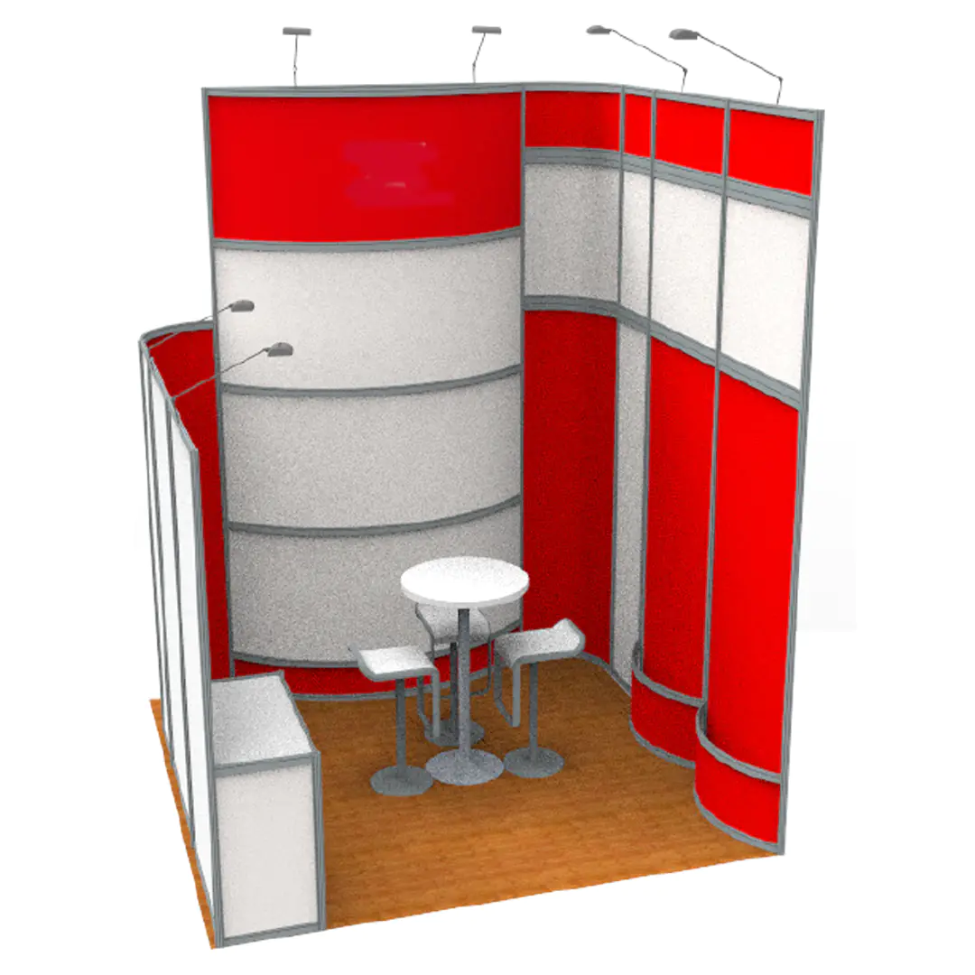 Es un stand de 3x3m atractivo para exhibiciones de interior con ubicación como cajón. Elaborado de estructura modular de aluminio con perfiles de sistema de exhibición de 8 direcciones. Se conforma por tres paredes con una mesa la misma estructura. Brinda una opción práctica y distinguida.