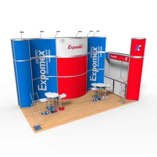 Es un stand de 3x6m atractivo para exhibiciones de interior con ubicación en esquina. Elaborado de estructura modular de aluminio, compuesta por perfiles de sistema de exhibición de 8 direcciones. Se conforma por dos paredes onduladas, una de ellas con mesas. Brinda una opción práctica y distinguida.