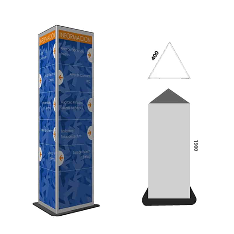 Señalamiento del sistema frente plano, con tres lados para colocación de información. Es una estructura de tres perfiles de aluminio triangulares, tapa del mismo material, perfiles larguero para unir postes y tres láminas de Alumark o PVC, donde se imprime el mensaje en UV, y con base para mayor estabilidad. Se adapta a distintos entornos ya que tiene espacio para poner todo tipo de información a una altura adecuada en interior o exterior.